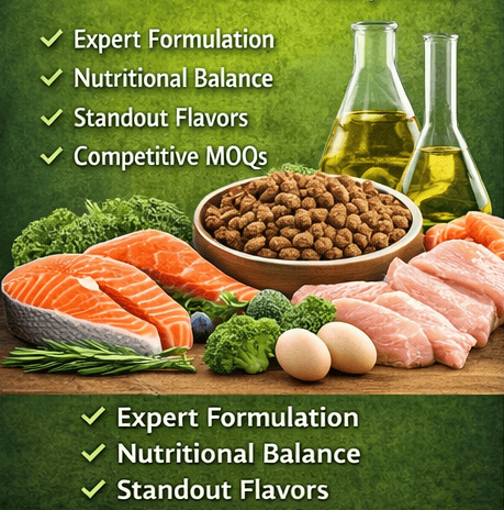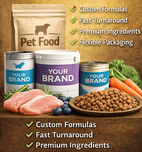 We help pet brands create premium pet food and treats with complete flexibility and expert support. From custom recipe development to packaging and full-scale production, we make launching and growing your own pet food line simple, reliable, and scalable.