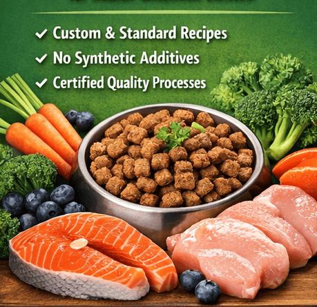 Pet food is a daily necessity in pet households worldwide, driving consistent demand and strong brand loyalty. Natural pet food is rapidly growing. Launch your own high-quality pet food range designed to stand apart. For Small-to-large brands | Custom & standard recipes | No synthetic additives | Certified quality processes